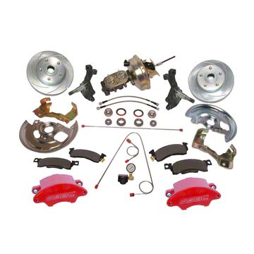 SSBC-USA Super Twin Front Power Drum to Disc Brake Conversion Kit with 2-Inch Drop Spindles and Dimple Drilled/Slotted Rotors; Red Calipers (64-72 Chevelle, Malibu)