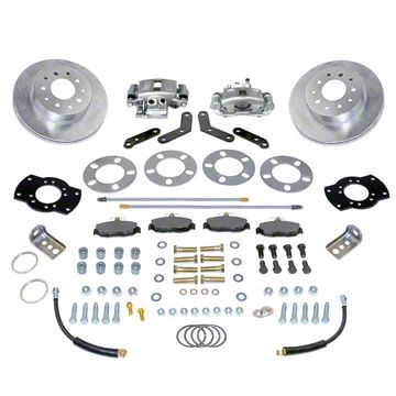 Calipers and adapters allow you to re-use your factory parking brake cable, and stainless steel shim washers align the caliper over the rotor. Kit includes DOT Flex hoses and new hard lines. All brackets are e-coated for long life rust prevention. 10.5 inch diameter vented rotors provide maximum durability. Easy to read instructions make this kit one of the best on the market!