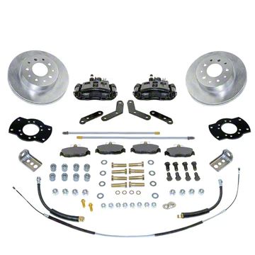 Calipers and adapters allow you to re-use your factory parking brake cable, and stainless steel shim washers align the caliper over the rotor. Kit includes DOT Flex hoses and new hard lines. All brackets are e-coated for long life rust prevention. 10.5 inch diameter vented rotors provide maximum durability. Easy to read instructions make this kit one of the best on the market!