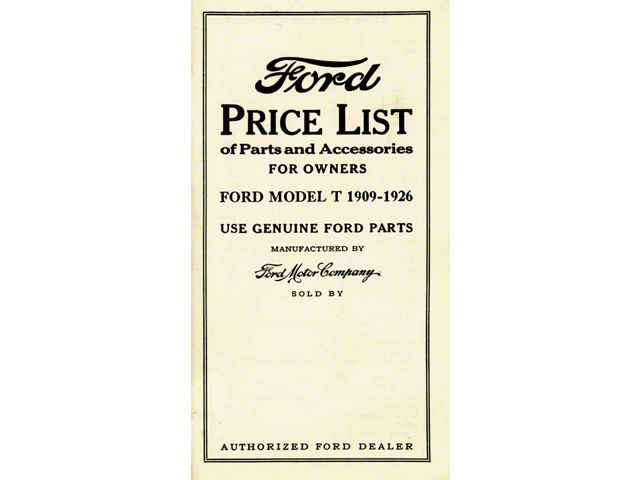 An illustrated listing of parts and accessories, presented in catalog format. This pocket book has pricing for genuine Ford parts for the 1909-1926 Model T, and shows what years will interchange.