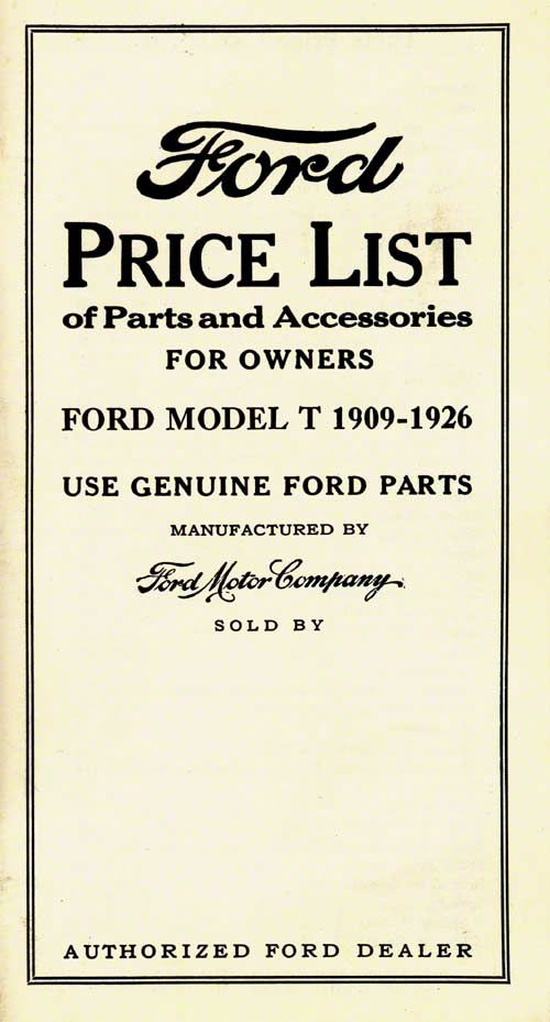 An illustrated listing of parts and accessories, presented in catalog format. This pocket book has pricing for genuine Ford parts for the 1909-1926 Model T, and shows what years will interchange.