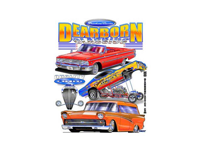 New custom t-shirt features the three awesome cars: 1963 Galaxie 500XL Convertible, 1968 Torino race car with Cammer motor and 1957 Fairlane station wagon street rod. All in stunning full color with Dearborn Classics logo. A must have shirt!