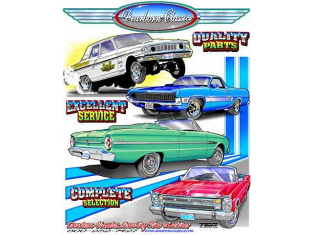 Our all new shirts design is sure to get your motor running! This new shirt features a 1964 Lightweight Thuderbolt Fairlane lifting off, a 1970 Rancher Ram Air Ranchero GT, 1963 Falcon Sprint Convertible and 1966 Galaxie 7 Litre. Some of the greatest Fords ever built in a full color detailed design. White 100% cotton shirt with color print on front. This new design is sure to please any Classic Ford enthusiast! Add 3.00 for XX size.