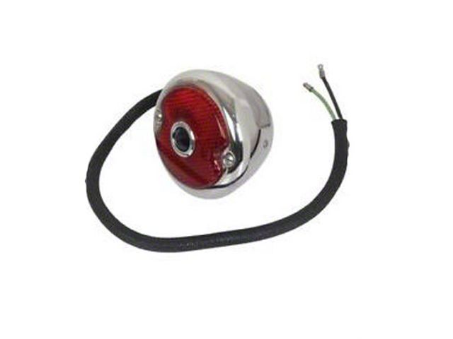 This assembly has a stainless steel housing and rim, red glass lens with blue dot, clear license light lens and comes with both 6 and 12 volt bulbs.