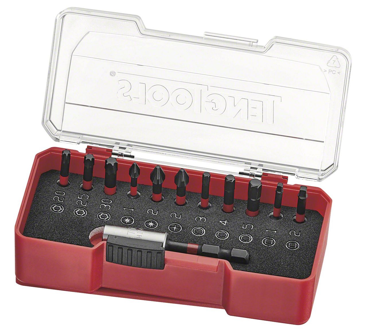 12 piece 1/4 inch impact set including all of the most commonly used pozi (PZ), ROB, hex and torx (TX) 1.18 inch/30mm long impact bits 1.18 inch/30mm long 1/4 inch hex impact bits: ROB1, ROB2, hex 3, 4, 5mm, GR2, PZ1, PZ2, TX20, TX25, TX30 1/4 inch drive accessories: 60mm magnetic impact bit holder Impact bits and accessories feature a new design for higher torsion and are suitable for use with impact power tools Supplied in a unique Teng Tools TJ tray featuring a clear fold up lid so you can see everything inside the set as well as a sliding catch to secure the set when not in use