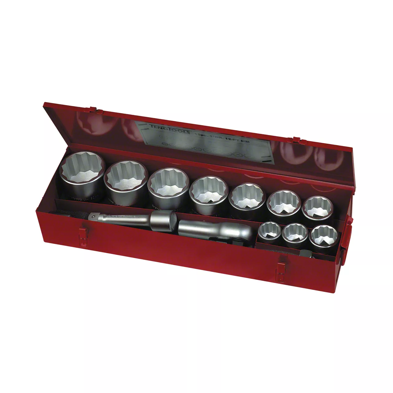 15 piece 1 inch drive metric 12 point socket set. Socket Sizes: 36, 41, 46, 50, 55, 60, 65, 70, 75, 80mm. Flip reverse ratchet with a satin finish. 22 inch long handle bar. 560mm T handle. 200mm and 400mm extension bars. The set comes supplied in a metal case with carrying handles. Teng Tools socket sets are organised in cases with functions and benefits that will make your daily work easier. When designing the box we have concentrated on making it practical, durable and easy to transport and work with.