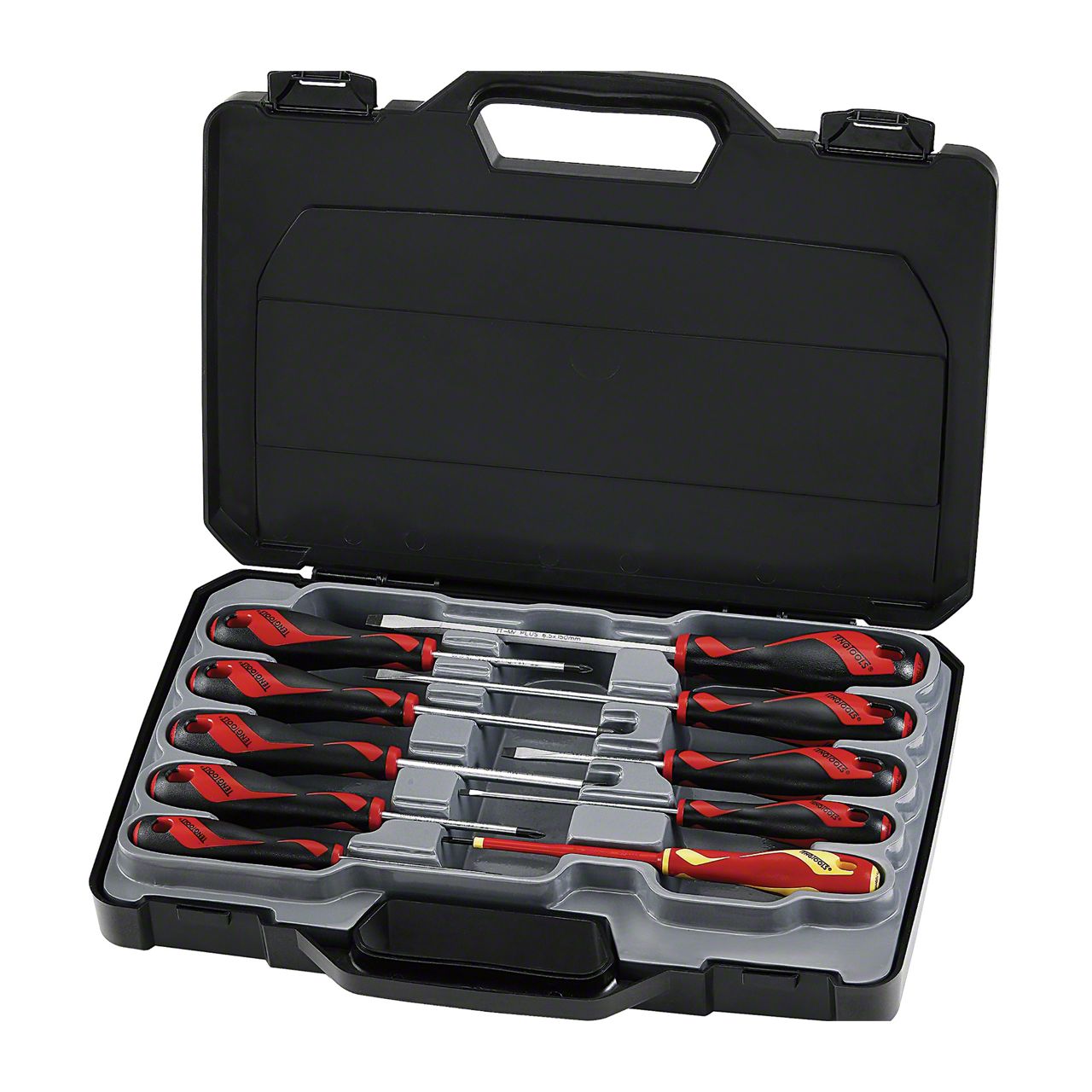 10 piece Screwdriver Set for Slotted, Phillips and Pozi drive heads. Flat Sizes: 3.0x100mm, 5.5x75mm, 5.5x150mm, 6.5x150mm, 1000 Volt Flat: 3.0x100mm, Phillips Sizes: PH0x75mm, PH1x75mm, PH2x100mm, Pozi Sizes: PZ1x75mm, PZ2x100mm. Screwdrivers in the Teng Tools Range have steel alloy TT-MV plus blades which gives 20% greater capacity than standard screwdrivers. This makes the shafts harder yet more flexible. The bi-material handles are designed to suit either your need for power transfer or speed. The handles are molded around the blade which ensures that all screwdrivers are completely straight and permits much larger wings on the blade (larger wings in turn create more torque). The hole in the handles are for tool securing when working at height, for hanging or for use with a T Handle for extra torque. Supplied in a handy storage case.
