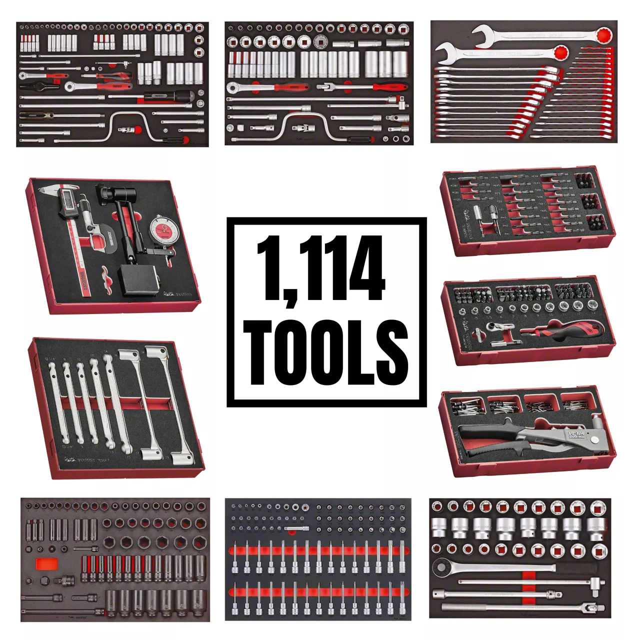 [ 1,117 PIECES ] This tool kit bundle contains all of the tools from the TCEMM1117N Mega Monster EVA foam tool kit (without the storage). [ TOOL BUNDLE ] Do you have your own tool storage but would like all of the tool trays that are included in the TCEMM1117N tool kit? If so then this bundle is for you. [ EVA FOAM ORGANIZATION ] Each tool has been scanned in a CAD CAM system with the tool’s exact shape cut out in a three-colored EVA foam block. The top layer of the foam is black, the intermediate layer white and the bottom layer red, so that as soon as the tool has been removed its position is clearly visible in red. The size and or description of each tool has been etched next to its position for immediate identification. [ SOCKETRY ] 1/4, 3/8, 1/2 & 3/4 inch drive metric and SAE shallow and deep sockets and accessories. [ IMPACT TOOLS ] 3/8, 1/2 & 3/4 inch drive metric shallow and deep impact sockets and accessories. [ WRENCHES ] Metric and SAE combination, ratcheting, double open ended, double ring, adjustable, vise grip and double flex wrenches. [ SCREWDRIVERS ] Slotted/Flat, PH, PZ, Hex and Power Thru screwdrivers. [ PLIERS ] Combination, side cutters, long nose, flat nose, snap ring, water pump, cable cutter and wire stripping pliers. [ + MORE ] Torque wrenches, bits, allen keys, insulated tools, pry bars, wheel removal tools, rivet tools, punches and chisels, measuring tools and more (see INCLUDED PRODUCTS section below for full details). **Tool storage not included**