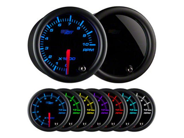 Construction and Appearance. This tachometer features a black gauge face with an illuminated red needle, offering a sleek and modern appearance. The gauge is equipped with a low-profile magnified tinted lens, enhancing visibility while maintaining a compact design. It utilizes stepper motor technology for a precise 270-degree needle sweep, and offers 7 LED color options for display customization, including blue, green, red, teal, yellow, purple, and white. The ultra-bright LED backlighting ensures clear visibility, even in low-light conditions, with an option to dim the display to reduce glare.