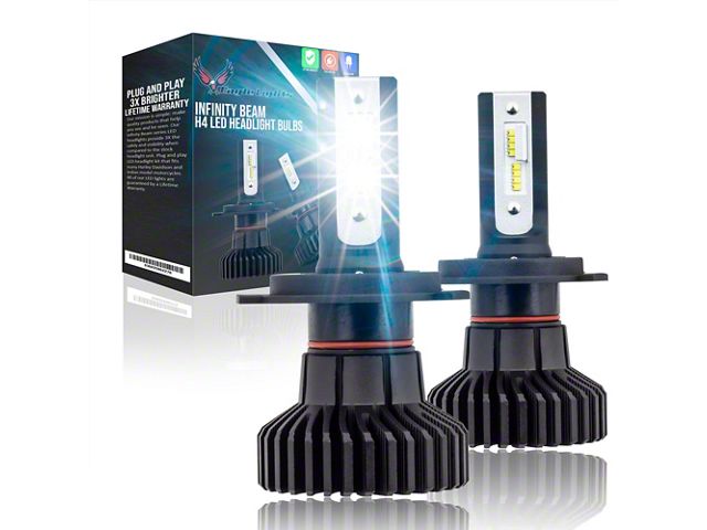 High-Performance LED Headlight Upgrade. The Infinity Beam LED Headlight Bulbs provide superior brightness with a 6000K cool white light, ensuring enhanced visibility on the road. Designed with an H4 configuration, these bulbs offer dual low and high beam functionality for versatile lighting performance.