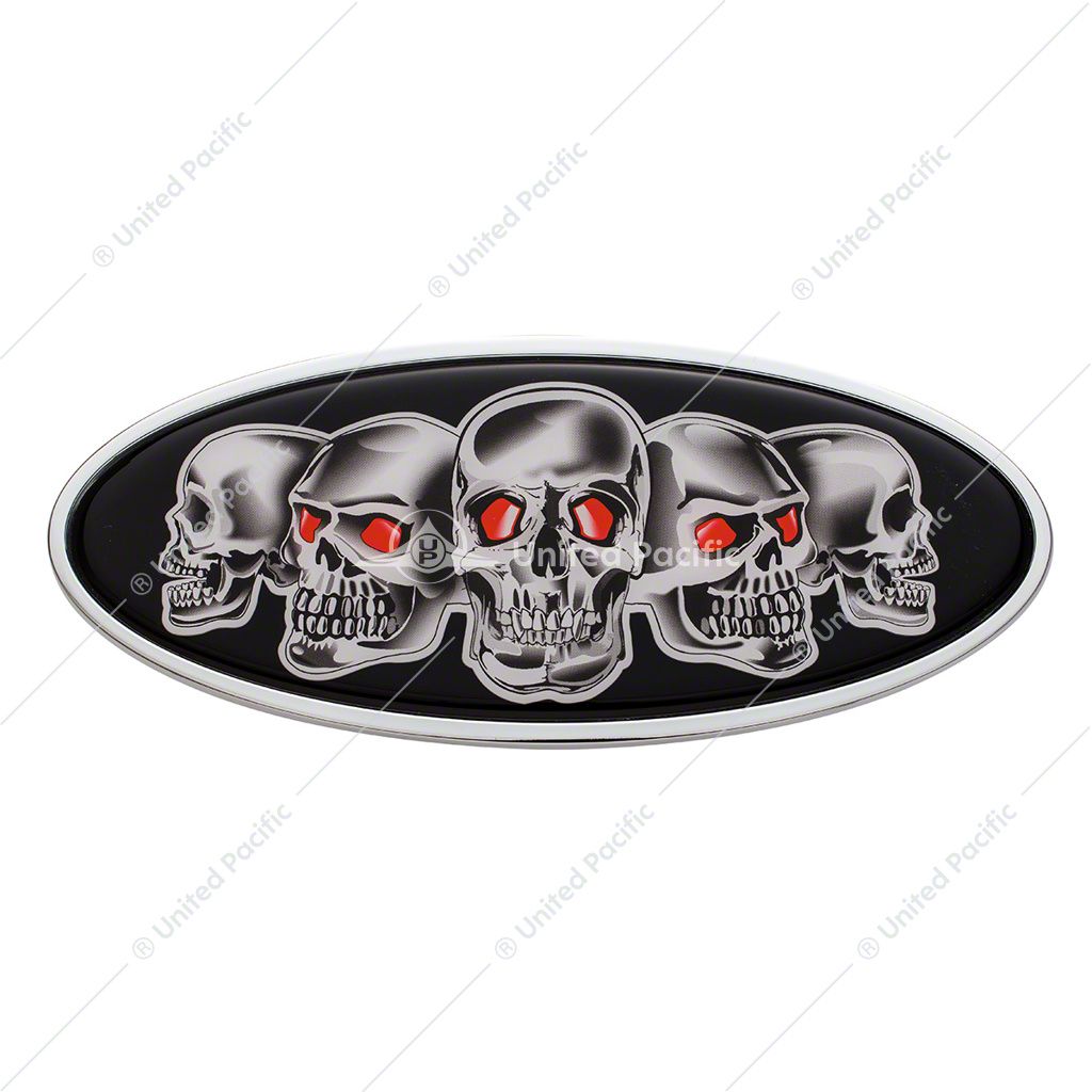 Beautiful high quality chrome plated finish with triple chrome plating process. | Sold each | Die cast oval emblem with silver outer accent and red eye socket | 7-7/8 X 3-1/4", aluminum decal | Mounting studs are 6-1/4" apart and speed nuts are included.