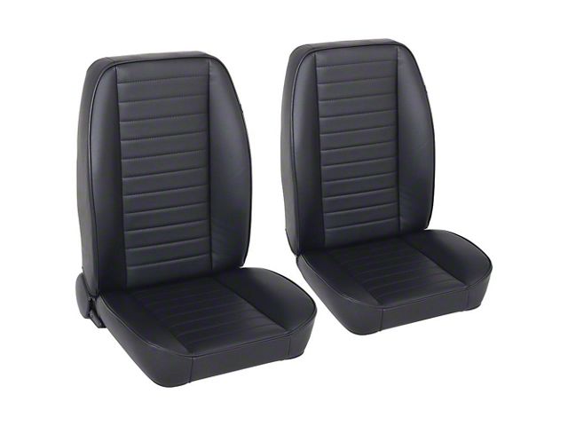 Construction and Appearance. Built with premium-grade materials, the seats feature fully-welded 1-inch diameter mandrel-bent steel frames and a proprietary TMI molded foam blend for superior comfort and support. Covered in Black Yukon Cricket Vinyl, the seats offer a sleek, timeless look that fits seamlessly with various interiors. The flat base and minimal bolstering preserve the OE aesthetic while adding a modern touch.