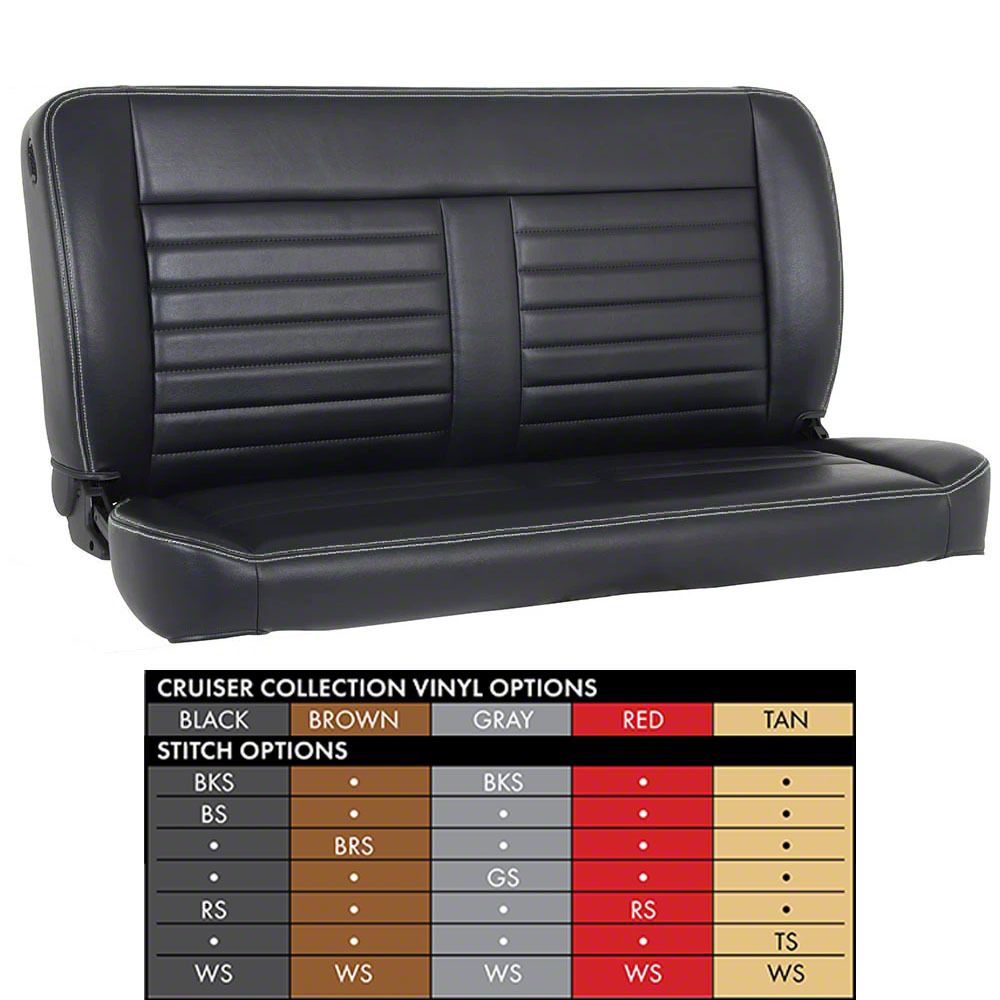 TMI 55" Solid Back Bench Seat, Cruiser Collection 47-9255-2295-BS,TMI 55" Solid Back Bench Seat, Cruiser Collection Black Madrid Vinyl W/Blue Stitch 47-9255-2295-BS,Classic styling with modern materials for exceptional support and comfort.,Color: 2295 Black Premium polyester foam backed vinyl,Contrast stitch options: Red, White, Blue, or Black.,Fully welded one-inch diameter mandrel bent steel frames with an adjustable seat back to fully recline your seat.,Proprietary TMI Molded Foam blend that meets low VOC UL Greenguard Gold standards with an FMVSS 302 Fire-Retardant rating.,Seat Dimensions - Height: 26.5 inches (mounting tracks add 2 inches to the height) - Width: 55 inches - Length of Base: 22 inches,Complete replacement bench seat with slider tracks to fit most applications.,Seat mounting brackets sold separately.