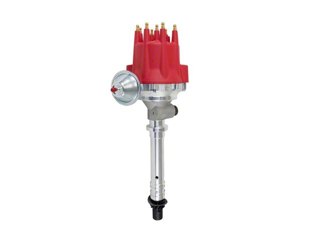Construction and Appearance. Crafted from CNC-machined billet aluminum, this distributor features a hardened steel shaft with a sealed ball bearing at the top and a sintered steel bushing at the bottom for durability and smooth operation. The red dielectric cap with solid brass terminals and color-matched wire retainer provides excellent conductivity and a striking appearance in your engine bay.