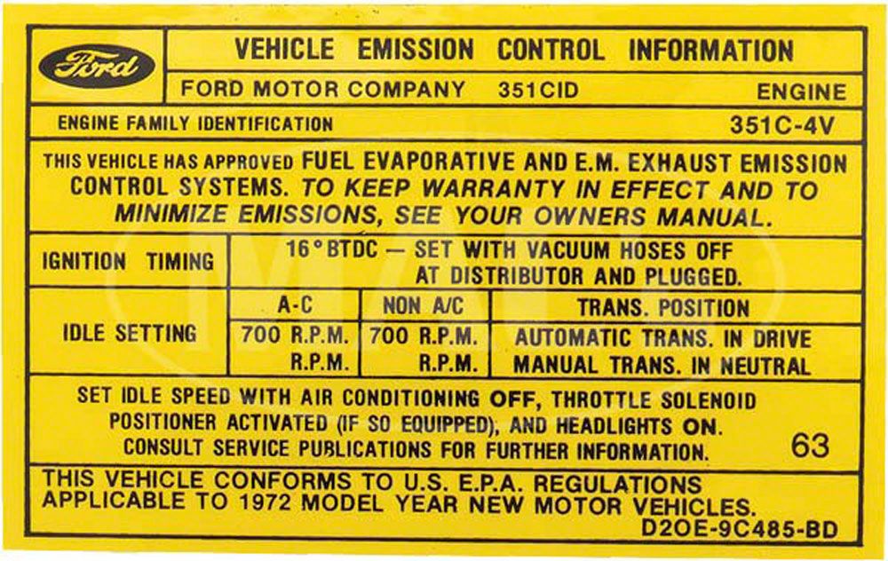 Emission Decal, 351C-2V AT/MT (1972 Torino)