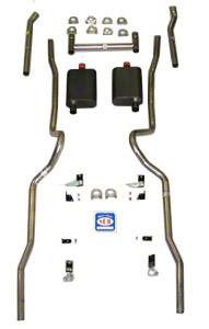 2" dual turbo with 3/4 headers with frame horns. Sedan and hardtop models only. Flanges must be welded. Turbo exhaust systems are pre-designed to accommodate after-market shock bar kits. Comes with Quickflow mufflers which are available in steel only. System is 304 stainless steel tubing.