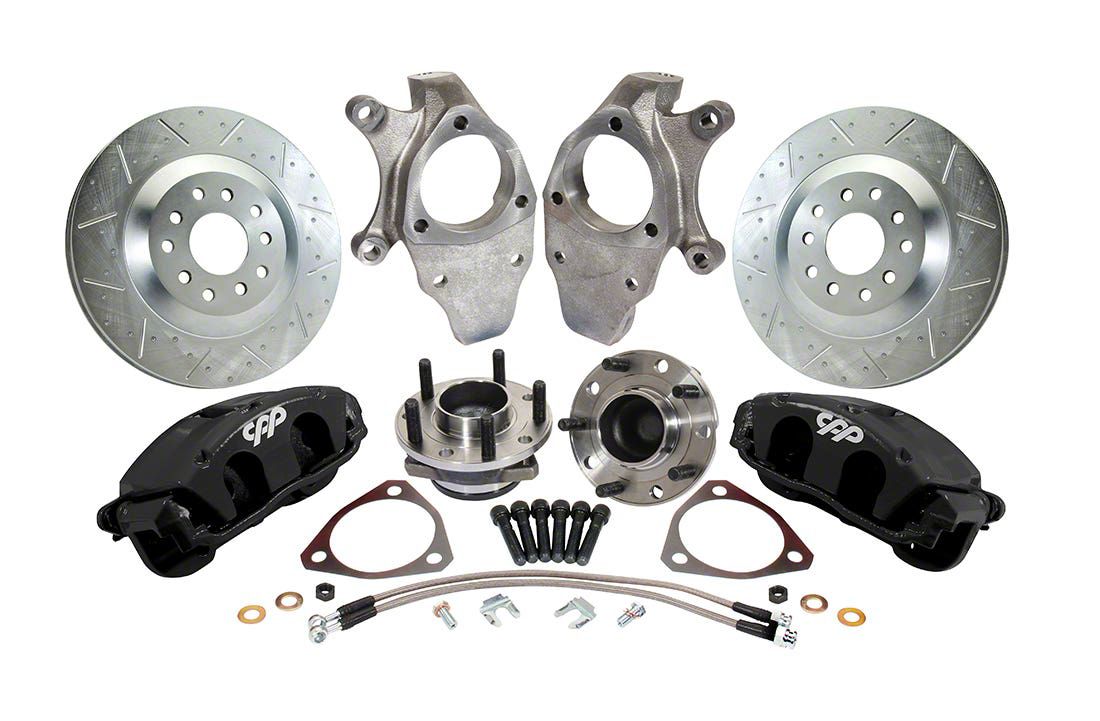 The CPP CS series brake kits utilize a new direct fit spindle that works with stock steering arms, offering a seamless upgrade for your braking system. This spindle is equipped with a C7 bearing hub assembly, which eliminates flex on the factory spindle pin, an issue that can cause caliper piston pushback, particularly with aftermarket multi-piston radial mount calipers. Each kit includes 13” C5 drilled and slotted rotors paired with C5 twin piston calipers and stainless steel hoses for enhanced performance. Designed to accommodate 17-inch wheels and larger, this kit is ideal for achieving optimal performance with 18-20” wheels. Additionally, for the 1955-57 Chevy Full Size, this CPP brake kit features 2" drop spindles and comes with a 5 on 4.75 bolt pattern, utilizing 7/16 x 20 studs. The C7 hubs are also equipped with 1/2 x 20 holes, allowing for the option to upgrade to larger studs if needed