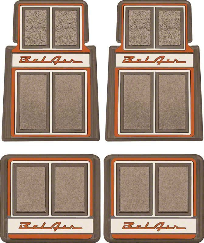 Protect your interior carpet and give your Tri-Five a unique look by adding these custom style floor mats for front and rear! Floor mats are designed for use with all 1955-57 Chevrolet Bel Air models, but can also be installed in One- Fifty Series, Two-Ten Series, and Nomad models. Each mat features the "Bel Air” logo in the correct early style script factory lettering. These custom mats are manufactured in high-grade automotive Plastisol material that offers years of long-lasting durability. Features a durable cut-pile carpet throughout the mat. Includes front and rear floor mats (4 piece set).