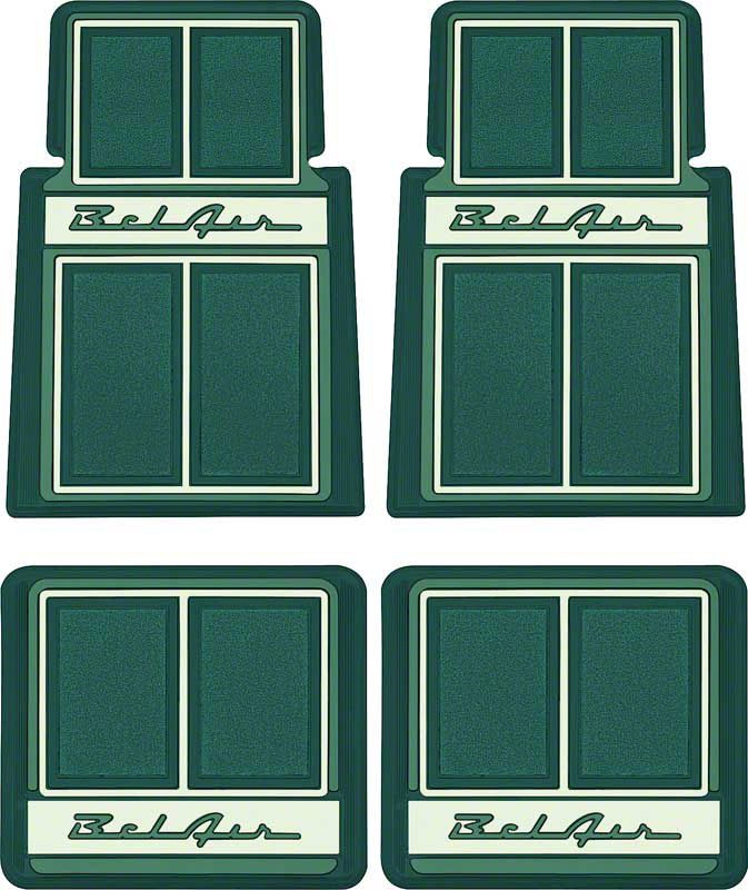 Protect your interior carpet and give your Tri-Five a unique look by adding these custom style floor mats for front and rear. Floor mats are designed for use with all 1955-57 Chevrolet Bel Air models, but can also be installed in One-Fifty Series, Two-Ten Series, and Nomad models. Each mat features the ‘Bel Air” logo in the correct early style script factory lettering. These custom mats are manufactured in high-grade automotive Plastisol material that offers years of long-lasting durability. Includes front and rear floor mats (4 piece set).