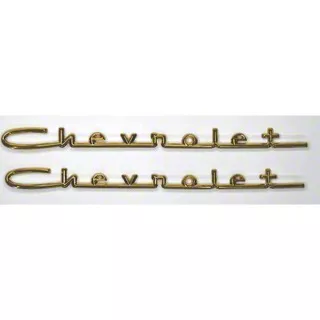 Classic Replacement Emblem. The Hood And Trunk Chevrolet Script Set; 13-Inch; Gold is designed to restore the distinctive styling of your 1957 Chevrolet. It replaces worn or damaged factory scripts, ensuring your vehicle maintains its authentic appearance. These scripts are essential for restoring the classic look and preserving the vehicle's value.