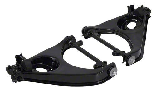 New stock style lower control arms designed for use with 1955-57 Chevrolet Bel Air, 150, 210, and Nomad models. Includes both RH and LH lower control arms with cross shafts, bushings, and ball joints pre-installed. Each lower control arm is manufactured from heavy gauge steel and black powdercoated. These control arms have a stock appearance and feature OE Style rubber bushings.