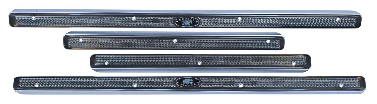 This Sedan / Wagon 4 door sill plate set with FISHER logo fits: 1955-1957 Chevrolet 150 1955-1957 Chevrolet 210 1955-1957 Chevrolet Bel Air Measurement 35x1.75x.1 Weight 6lb Replaces GM part number 4651279