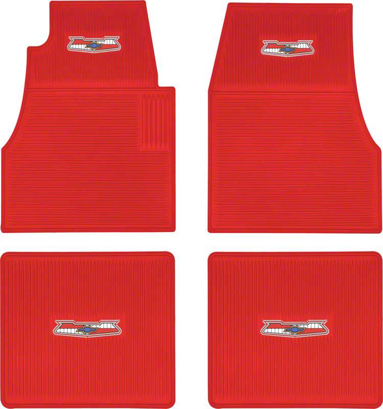 Distinctive Floor Mat Set. The Ribbed Rubber Front and Rear Floor Mats with Chevrolet Crest; Red provide protection for your vehicle’s interior carpet while enhancing the classic appeal of Chevrolet’s Tri-Five models. These mats are designed to fit perfectly in the front and rear of the vehicle, combining style and functionality important for vehicle preservation and authentic restoration.