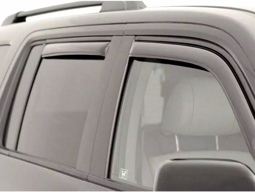 Construction and Appearance. Each deflector is crafted from rugged ABS material that resists UV damage and surface scratches, ensuring long-term durability in a wide range of environments. The dark smoke finish adds a refined look that blends cleanly with factory window trim, creating a smooth and integrated appearance.