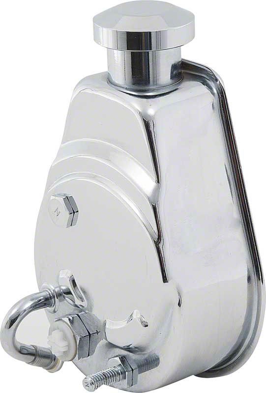 Dress up your engine compartment with this all new Authorized chrome power steering pump with a banjo style reservoir. This all new pump is a great replacement for 6 or 8 cylinder models. This power steering pump features a reservoir in the correct original configuration with the proper return fitting and clocking. This not only improves authenticity, but makes installation quick and easy.