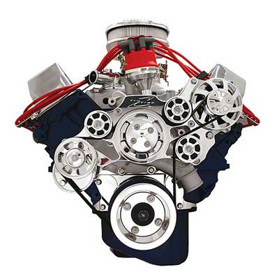 Billet Specialties Tru Trac serpentine system. These Tru Trac serpentine systems are designed to increase the efficiency of the alternator and compressor by eliminating belt slippage. Tru Trac serpentine systems include: * Polished Powermaster 105 amp 1-wire alternator * Polished billet aluminum alternator fan and pulley * Edelbrock reverse rotation water pump * Polished billet aluminum water pump pulley * Polished billet aluminum bridge bracket * Patent-pending billet aluminum tensioner specifically engineered for each Tru Trac serpentine system * Polished billet aluminum tensioner pulley * Polished billet aluminum crankshaft pulley * Polished ARP 12-point stainless steel fasteners * Goodyear Gatorback 6-rib serpentine belt * Comprehensive installation manual