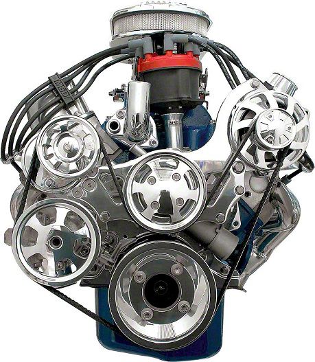 Tru Trac Serpentine System features easy straight forward assembly, no spacers, no washers and no running around for anything. All the needed hardware and fasteners are included with each kit. The entire Tru Trac System mounts to engine block, allowing any cylinder head/intake configuration. Manual Steering Kits Includes: •New Polished Power Master 105 amp one wire alternator. •Polished Billet Aluminum Alternator Bracket •Polished Billet Aluminum Alt Fan and Pulley •Polished Billet Aluminum Support Bracket •New Edelbrock Aluminum Reverse Flow Water Pump •Polished Billet Aluminum Water Pump Pulley •Polished Billet Aluminum Serpentine Belt Tensioner Specifically Made For This System •Polished Billet Aluminum Belt Tensioner Pulley •Polished Billet Aluminum Crank Pulley •Stainless