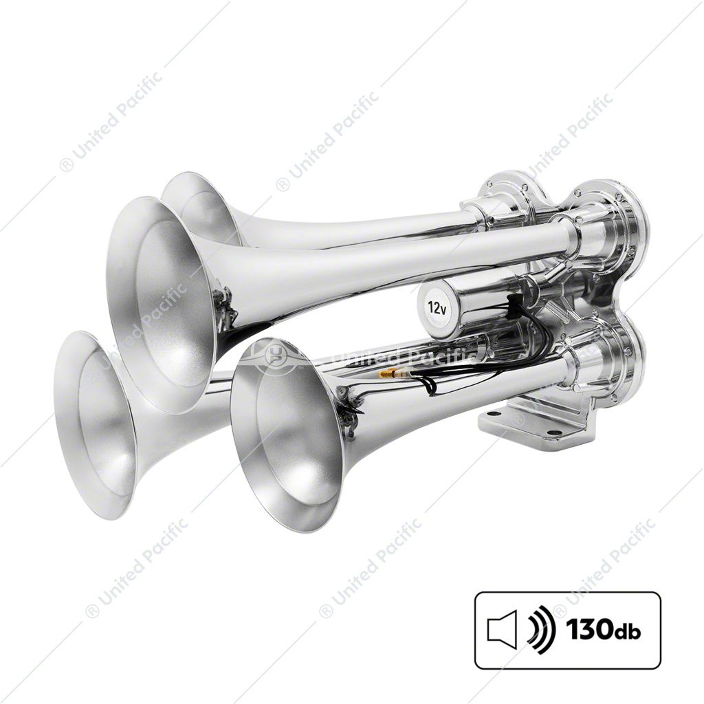 4 Trumpet Mini Train HornSuper loud sound output: 130db +/- 10db.12V heavy duty electric air solenoid included.Includes mounting pad & hardware.Air Pressure: 150 PSI maximum.