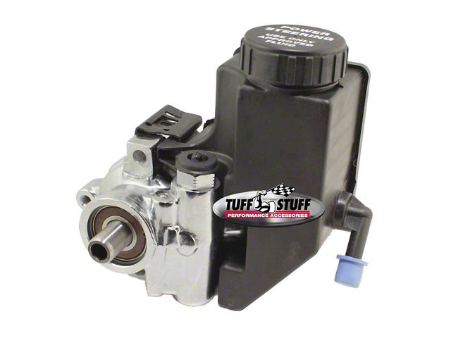 Compact size aluminum pump with reservoir is ideal for tight installations. 1200 PSI rating, 3 GPM. Optional 850 PSI rating, 2GPM valve sold separately. Available in chrome plated, polished, black powder coat or as cast finishes. Perfect for street rods and custom vehicles with limited engine space. Tuff Stuff power steering pumps are quality built in USA from 100% new components, are tested to far exceed OEM specifications and carry a one-year limited warranty.