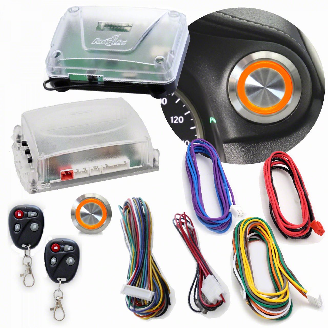 Kit includes: 12V non-illuminated billet aluminum push button switch, start/stop remote start control module, and keyless entry system with 2 remote key fobs and Bluetooth smartphone app.