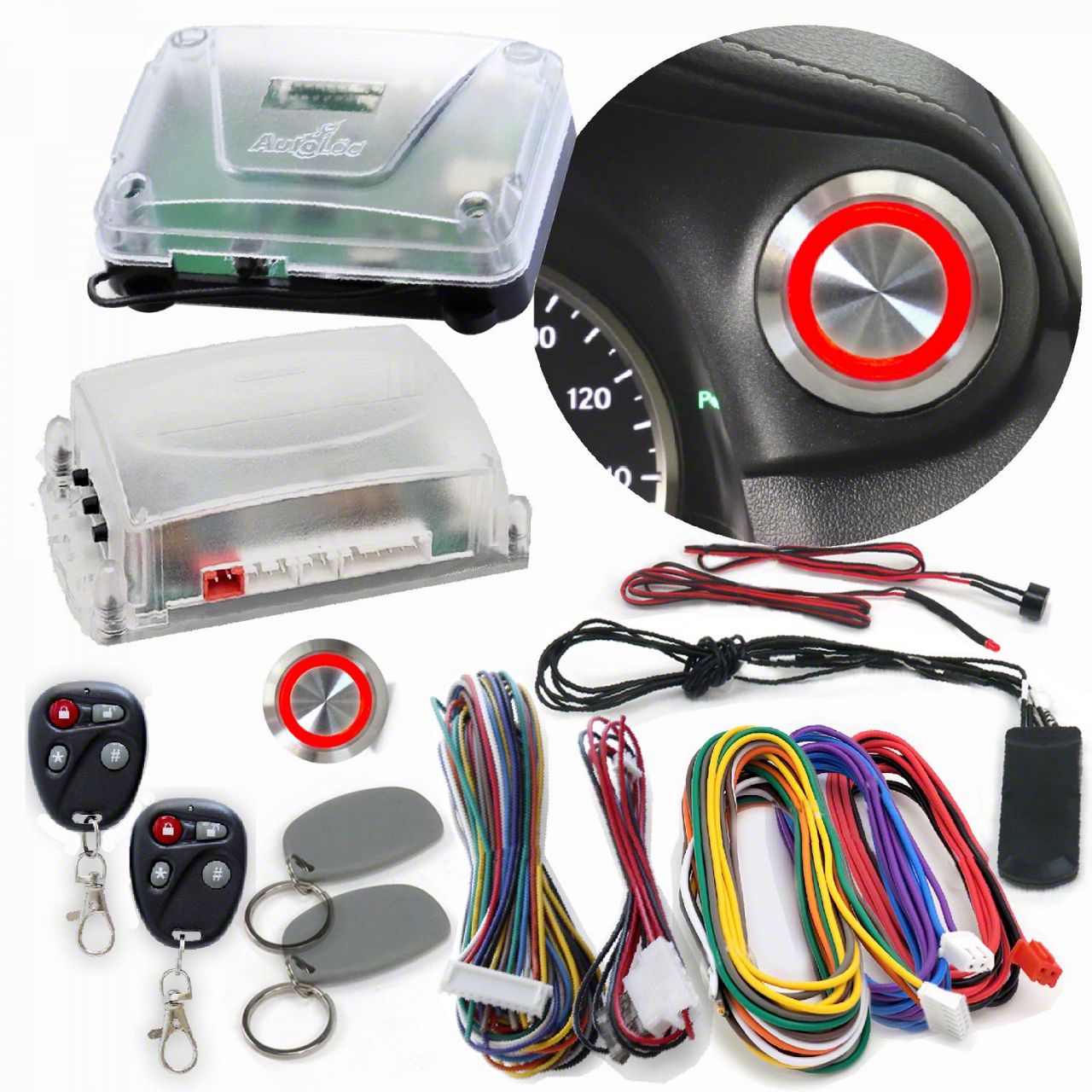 Kit includes: 12V non-illuminated billet aluminum push button switch, start/stop remote start control module, and keyless entry system with 2 remote key fobs and Bluetooth smartphone app.