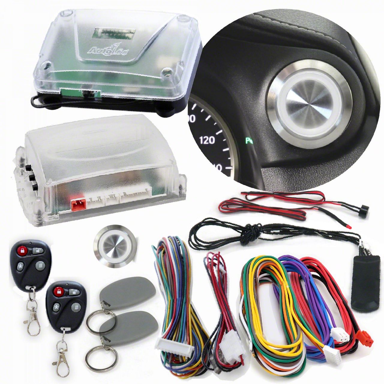 Kit includes: 12V non-illuminated billet aluminum push button switch, start/stop remote start control module, and keyless entry system with 2 remote key fobs and Bluetooth smartphone app.