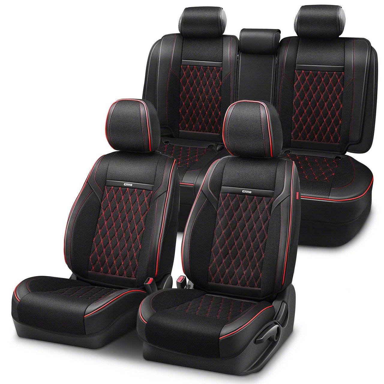 Diamond Series Front Bucket and Rear Seat Covers; Black Leatherette with Red Stitching (Universal; Some Adaptation May Be Required)