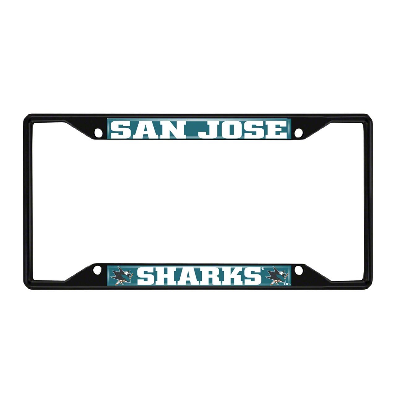 License Plate Frame with San Jose Sharks Logo; Black and Turquoise (Universal; Some Adaptation May Be Required)