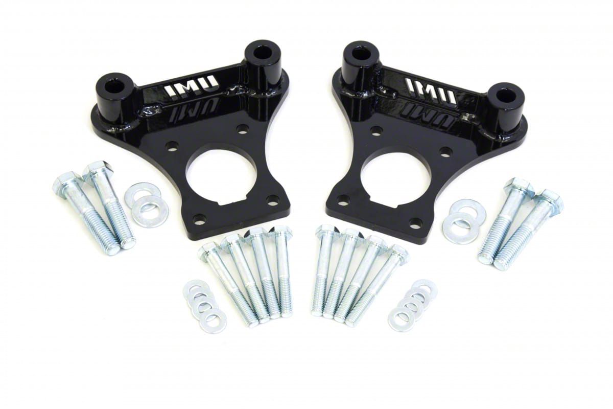 The UMI 2120 brake conversion bracket allows you to mount 1997-2013 C5 or C6 front calipers and rotors to the 93-02 GM F-Body spindle. Made of 3/8” thick mild steel, these brackets are CNC laser cut and feature CNC turned stand-offs that are fully welded to ensure strength and precision fit. The brackets come in a heavy duty black powder coat finish and include Grade 10.9 mounting hardware and detailed installation instructions. LT1 and LS1 spindles require modifications for installation, with LS1 models requiring less cutting than LT1. Instructions are included. The conversion brackets only include the adaptor brackets; rotors, calipers, abutment brackets, and pads must be purchased separately for complete installation.