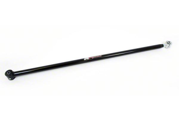 This tubular single adjustable panhard bar replaces the flimsy stock stamped panhard bar while adding increased strength and rear end adjustment. This panhard bar is a must for rear end centering after vehicle lowering, as well as clearance for running larger tires. The installed Roto-Joint allows for adjustments off the car to quickly lengthen or shorten the panhard bar to the desired length. The spherical Roto-Joint/polyurethane bushing combination eliminates most rear end bind while not sacrificing ride quality. This item is an excellent improvement for your street or drag application.