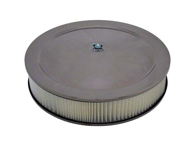 This is a brand new 14 inch round black chrome air cleaner set. It comes complete with top, recessed base, filter and stud with wing nut. This black air cleaner fits single quad carburetors with 5-1/8" neck. Dimensions: 14" x 3".