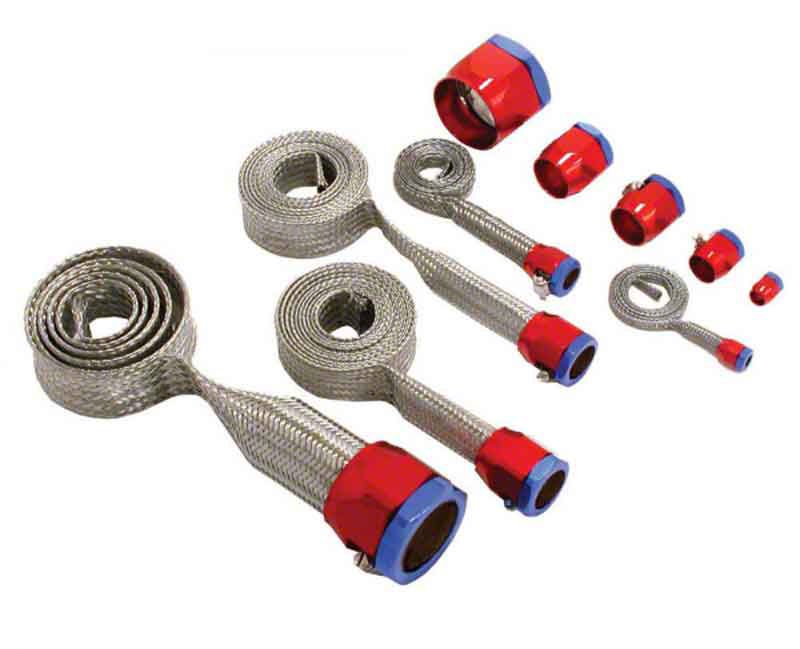 Give your engine the race-prepared, high performance look with this stainless steel hose cover & simulated pressure fitting kit . The flex braid material slips over the stock hoses, is cut to size and secured with the clamps. This kit includes enough braid material and clamps for the upper radiator hose, two heater hoses, fuel pump-to-carburetor gas line and two vacuum lines.