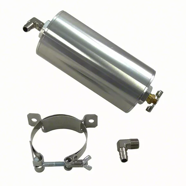 Construction and Appearance. Constructed from lightweight billet aluminum, this coolant overflow tank combines durability with a sleek, professional appearance. The tank features nickel-plated 80 degree 3/8 barbed end fittings and a built-in vent to prevent pressure build-up, ensuring both efficiency and safety. Its finish adds a clean, aesthetic touch to any racing setup. This overflow tank includes a convenient drain cock for easy maintenance and a nearly full quart capacity to handle more coolant, enhancing its functionality without frequent refilling.
