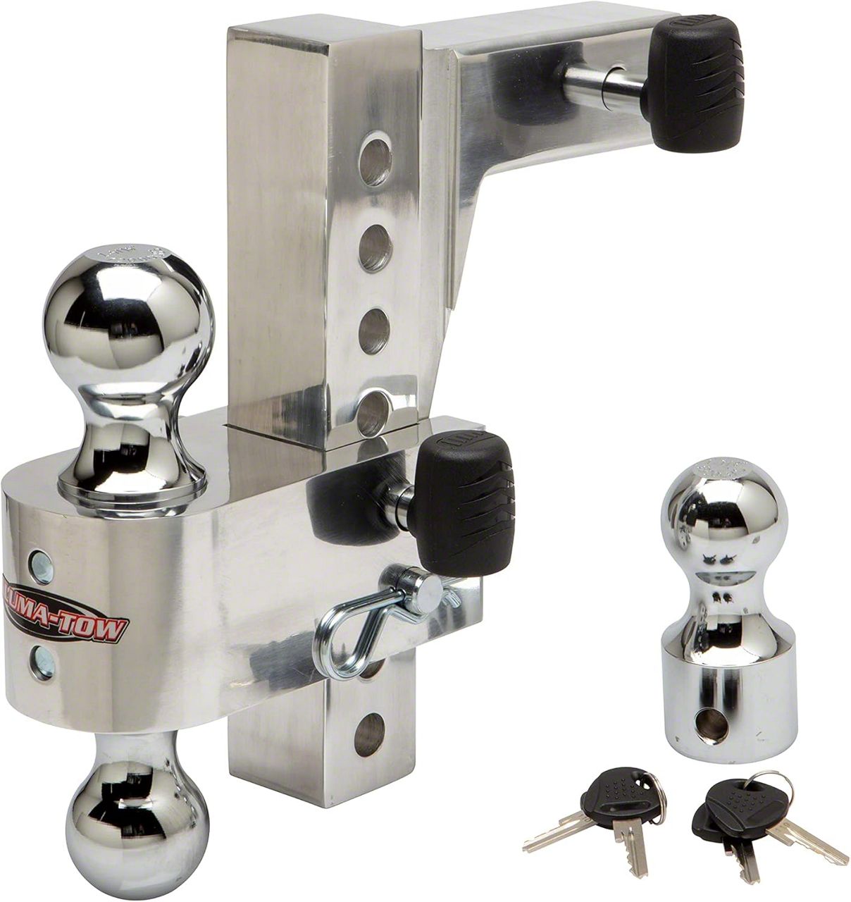 Uriah Products Aluma-Tow 8" drop provides you with one product for all of your towing needs. It has the highest rated gross trailer weight on the market of 12,000 lbs, allowing you to haul heavier loads with ease. The adjustable ball mount fits into a standard 2" square receiver and has a 8" max drop distance and a 8 3/4" max rise distance which is adjustable in 1" increments. Included are 3 independent steel, chrome plated interchangeable hitch balls (1 7/8", 2" & 2 5/16") covering all vehicle sizes. The kit includes two locking hitch pins with 4 key-to like keys that prevents theft while connected to your vehicle.