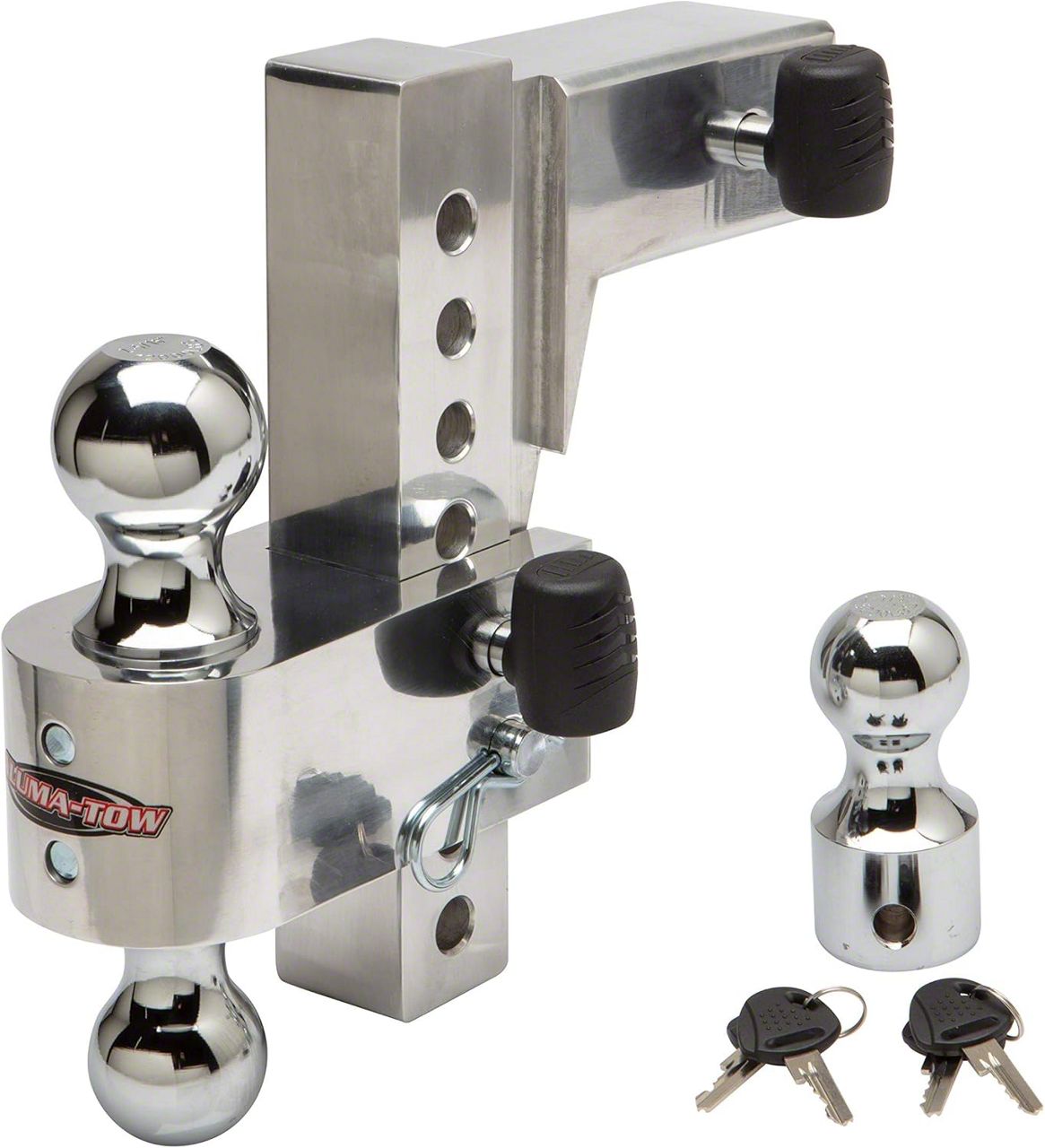 All your towing needs will go off without a hitch thanks to the Uriah Aluma-Tow Adjustable Aluminum Tow Truck Car Trailer Hitch Mount 8-Inch Drop. With its 3-interchangeable-ball system and adjustable 1-inch increments, this hitch has unparalleled versatility when it comes to fitting into any 2.5-inch standard square receiver. The 3 featured balls measure 1 7/8 inches, 2 inches, and 2 5/16 inches, with an 8-inch drop or rise. Each ball features a towing capacity of either 5,000 pounds (1-7/8-inch ball), 7,500 pounds (2-inch ball), or 12,000 pounds (2-5/16-inch ball). Constructed with lightweight aircraft-quality aluminum alloy, the durable, heavy-duty design will ensure life-long use. The mount has 2-keys-alike locking hitch pins to deter theft and provide extra security while the hitch is connected to your vehicle. An improved design features a sliding key cover that protects the locks from dirt and grime. Aluma-Tow's patented interchangeable design makes it easy to configure your hitch to suit your towing needs. This mount is made to improve the efficiency of large tasks and heavy-duty projects whether in your shed, garage, or workshop. Rest assured and know that what you tow will be in good hands when you use the Uriah Aluma-Tow Adjustable Aluminum Tow Truck Car Trailer Hitch Mount 8-Inch Drop.