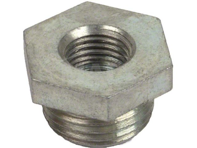 Zinc finished adapter measures 5/8"-18 male end and 3/8"-24 female. Between the two is a hex that measures 3/4" across the flats. Total overall length of the adapter is .48"