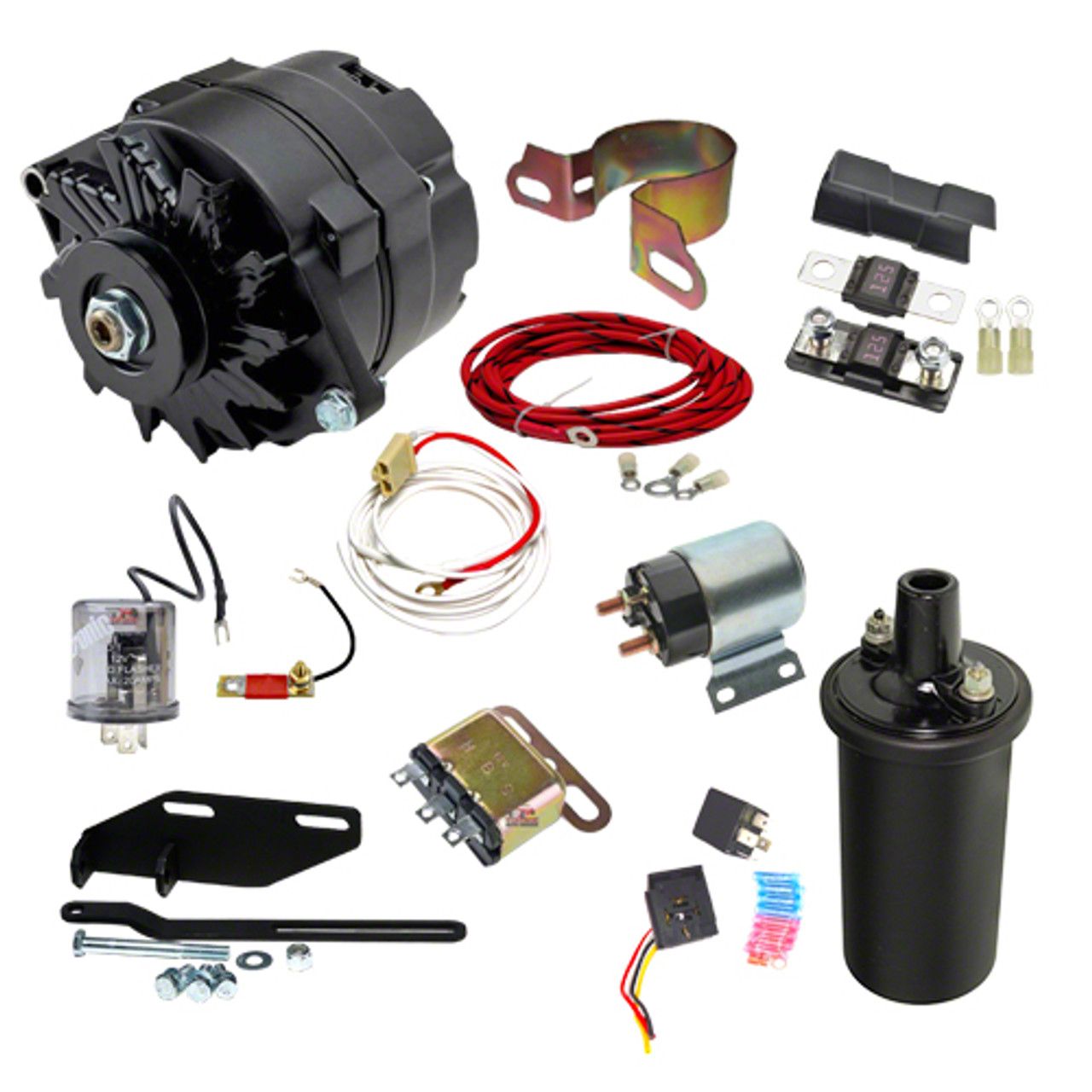 1948-1954 Chevrolet Cars 12v 100 amps Conversion With Electric Key Starter or push button starter on dash.This kit is for Chevrolet cars with electric starter utilizing start solenoid mounted onto the starter versus foot pedal starter.Kit contains the parts needed to convert your Chevrolet car or in some cases a truck from 6 volts to 12 volts using an alternator. 100 amp GM black alternator configured with 3/8" pulley .Includes: 100 amp 2 wire GM black alternator (3/8" pulley) with easy fit Bracket, Headlight Relay, Horn Relay, Coil, Gas Gauge Voltage Reducer, charge Plug, 10 gauge alternator connection wire, 125 amp fuse and starter solenoid.Complete easy to follow instructions.1 year warranty.