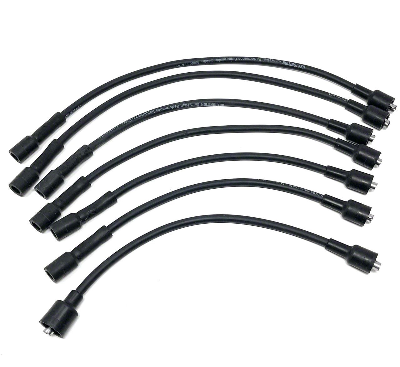 Set of Seven Stock Looking 8MM Spark Plug Wires Made to Fit Chevy 216-235 6 cylinder engines. Description:This is a custom set of 8mm silicone black spark plug wires to fit your Chevy 216-235. Straight boot spark plug ends clip directly onto the spark plugs. Designed for inline 6 cylinder motors with point type caps. Lengths sent are 13", 13", 15", 15", 18", 18", and 13" coil wire.8mm Spiral Core wire for electronic ignitions- 500 Ohms resistance per footSocket type distributor endsStraight Spark plug endsSold as set ready to installSpark plug wires ready to run both straight spark plug and distributor end ready to install.