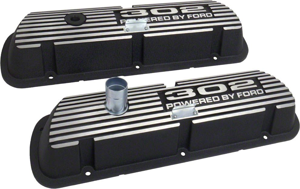 Our black wrinkle finish, powder coated valve covers, shout hi-performance. Pressure die cast using 383-3 aluminum alloy, they include an improved oil baffle design for use with high lift camshafts. The oil filler tube is cadmium plated to resist corrosion. The lettering and the fins are left natural aluminum to offset the powder coated black for a very sixties look. Spark plug wire brackets and the PCV grommet are included. Pick your favorite and dress up your engine compartment today!