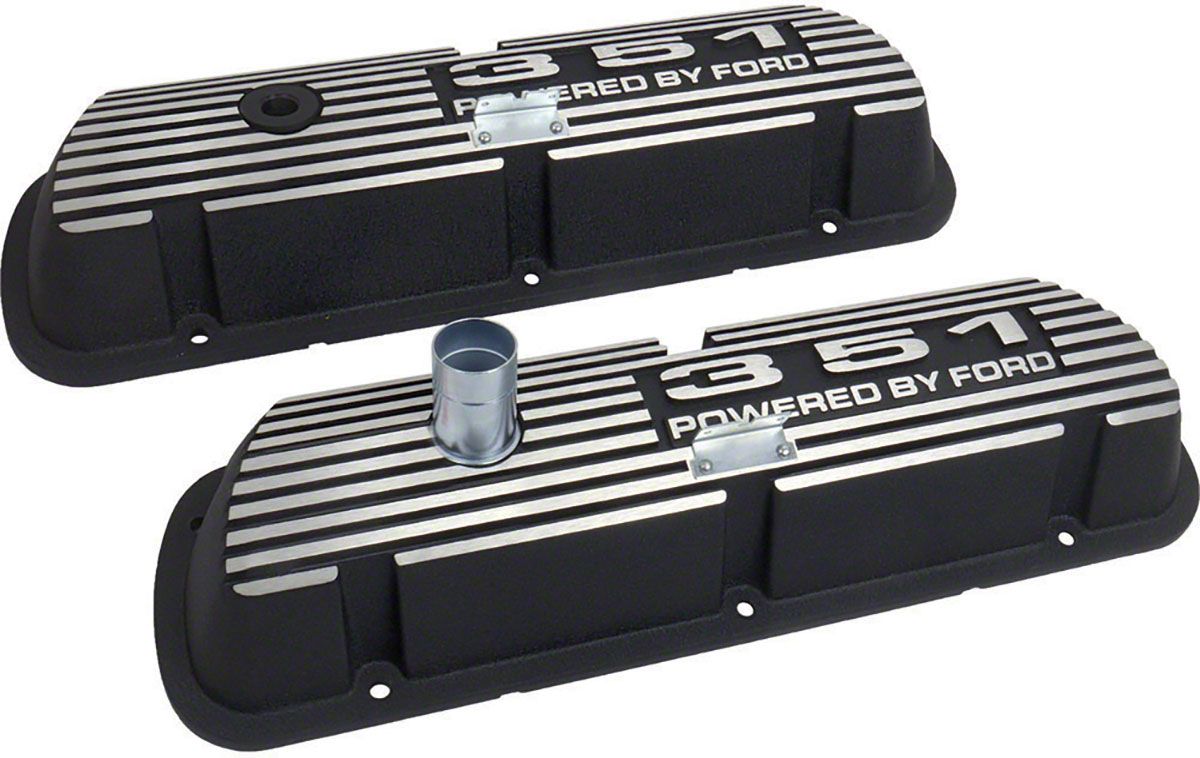 Our black wrinkle finish powder-coated valve covers shout hi-performance. Pressure die cast using 383-3 aluminum alloy, they include an improved oil baffle design for use with high lift camshafts. The oil filler tube is cadmium plated to resist corrosion. The lettering & the fins are left natural aluminum to offset the black powder-coat for a very sixties look. Spark plug wire brackets and the PCV grommet are included. Pick your favorite and dress up your engine compartment today! Note: will fit all small blocks, including 260, 289, 302 & 351W except E.F.I. equipped engines.